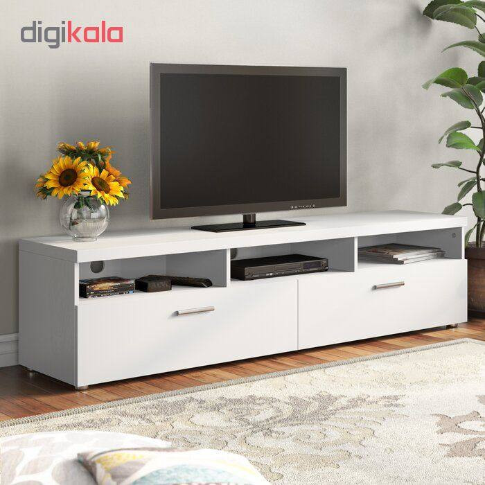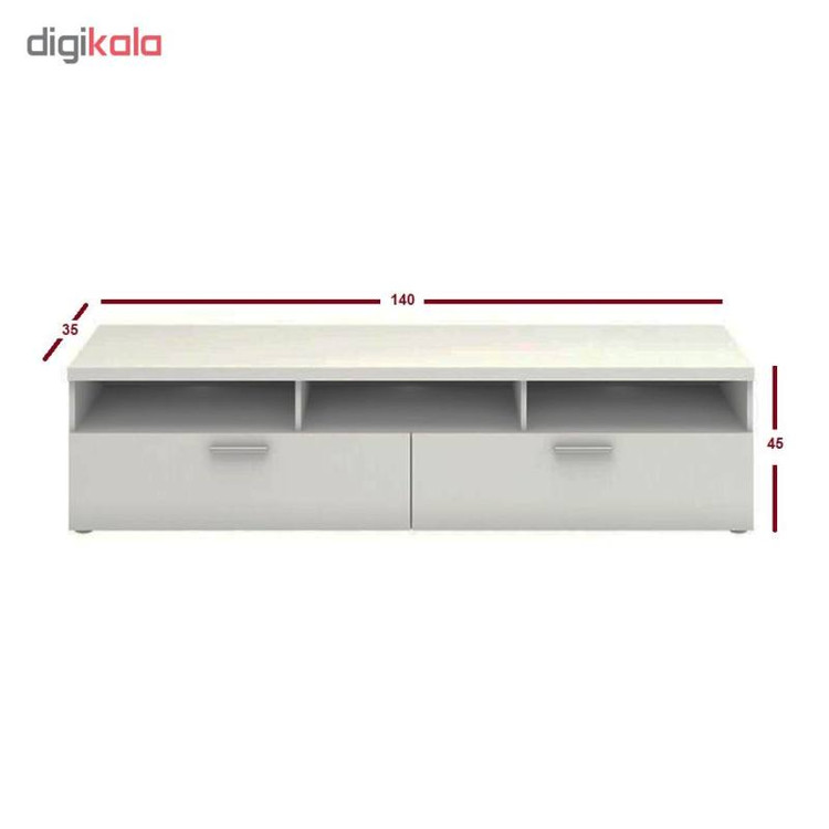 این میز تلویزیون سه قفسه باز و دو کشوی بزرگ جهت قراردادن رسیور و دستگاه پلیر و کنسول و دکوری دارد . جنس این میز تلویزیون بر خلاف نمونه های مشابه تماما از ام دی اف (MDF) مرغوب است که علاوه بر زیبایی باعث میشود طول عمر آن نسبت به سایر محصولات بیشتر باشد و به مرور آسیب نبیند . برای استحکام و زیبایی هر چه تمام تر جنس بدنه و طاق (روی میز LCD ) از MDF دوبل شده (32میلیمتر) تولید شده و بقیه 16 میلیمتر MDF است . ارتفاع این میز کاملا استاندارد بوده و در حین تماشای تلویزیون نیازی به تغییر ارتفاع نیست .