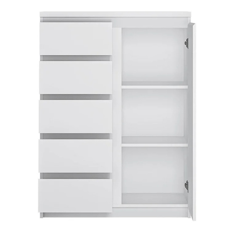 کمد چندمنظوره جنس روکش از ملامینه درجه یک میباشد و دارای پنج عدد کشو با ریل ساچمه ای با کیفیت و دارای یک درب با لولای آرام بند با کیفیت و داخل درب دارای سه طبقه میباشد و این کالا از استحکام و مقاومت بالایی برخوردار است و در رنگ بندی های زیبا و شکیل میباشد.