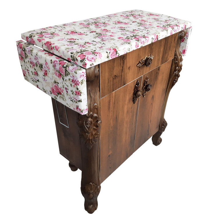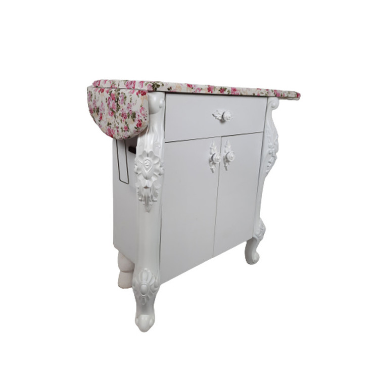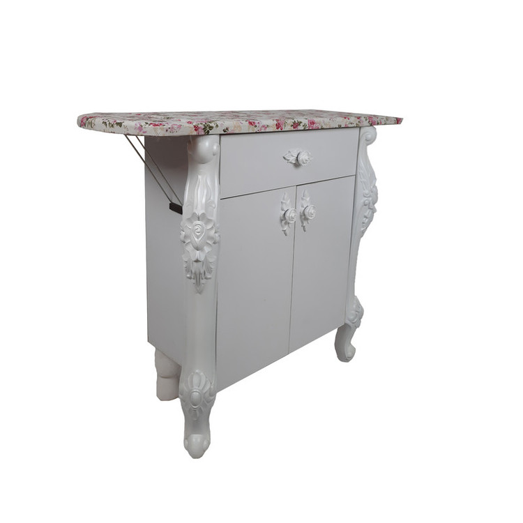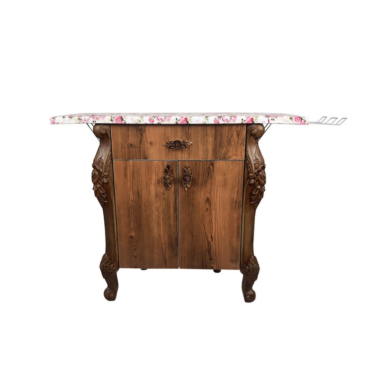 این مدل میز اتو به دلیل داشتن پایه های منبتی از زیبایی ظاهری به سزایی برخوردار است. در رنگ کاری پایه ها از رنگ خودرو استفاده شده که باعث مقاومت و ضد خش بودن آن می شود. کشو جادار می باشد و محفظه زیر کشو بدون طبقه می باشد.