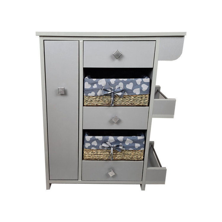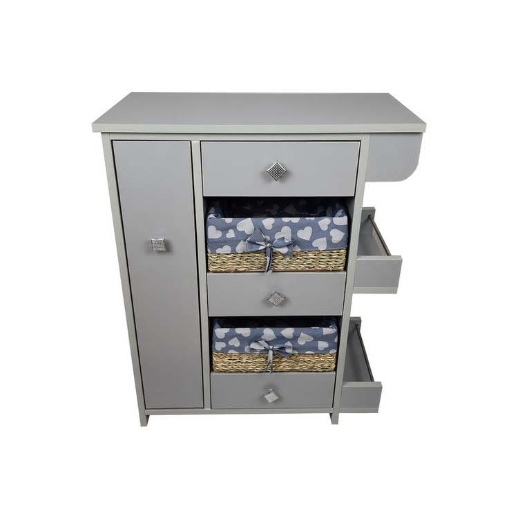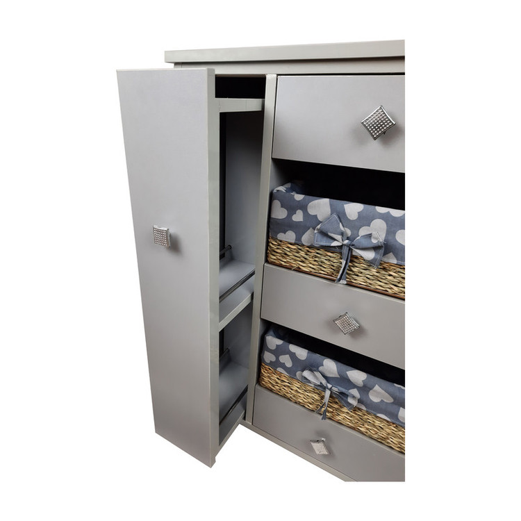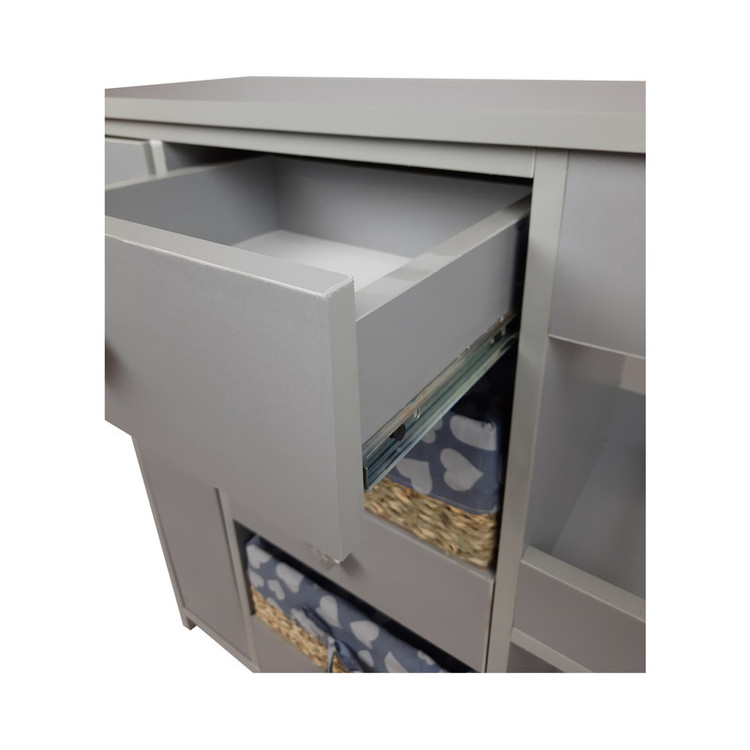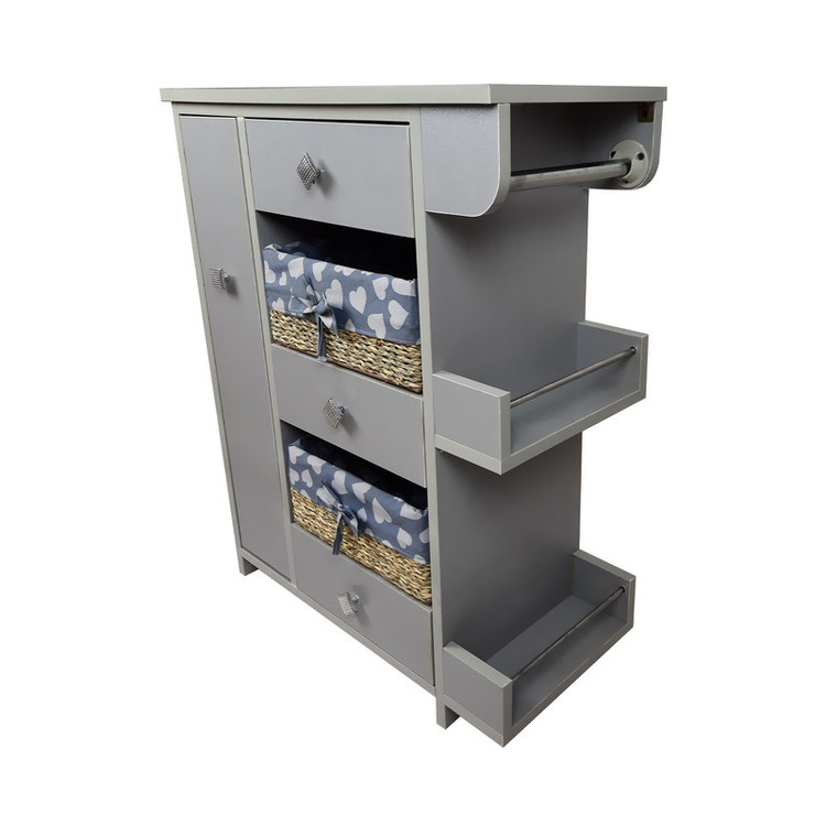 این محصول دارای سه کشو و دوسبد می باشد. سمت راست طبقاتی تعبیه شده که برای قرار گیری بطری یا شیشه ها می توان استفاده کرد. قسمت بالای آن نیز میله ای قرار گرفته که دستمال آشپزخانه یا دستمال کاغذی در آن قرار می گیرد. در قسمت سمت چپ محفظه دو طبقه ای تعبیه شده که بطری یا شیشه ها را در آن می توان قرار داد. توجه شد که: تمامی کشوها و محفظه کناری دارای ریل می باشند که استفاده از آن ها را آسان می کند.