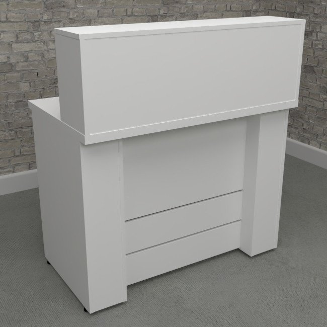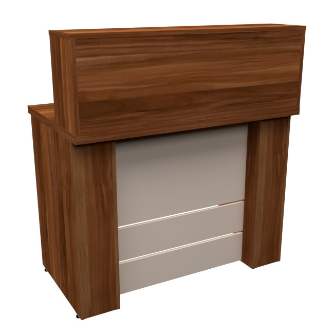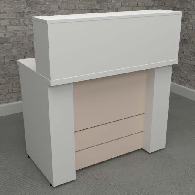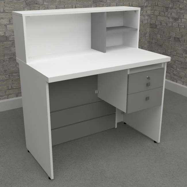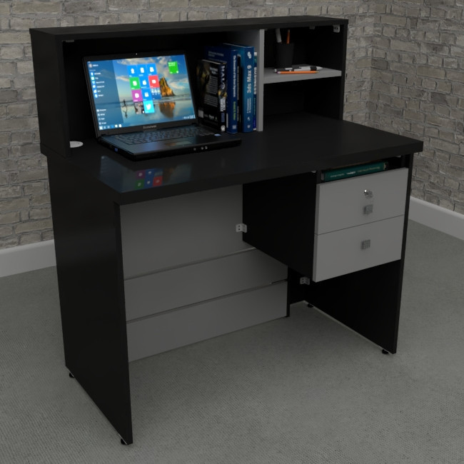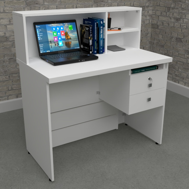 این محصول دارای دوکشو در ابعاد مفید 26x37 سانتی متر با ریل ساپمه ای 2 تکیه که یک کشوی آن نیز قفل دار است . فضای بالای باکس کشو به عنوان کازیه فضای مناسب جهت قرار دادن کتاب یا سررسید را دارد . پایه های میز به گونه ای طراحی شده که قابلیت تحمل وزن بیشتری را داشته باشد . نمای جلوی آن بوسیله ستونهایی که منتج به پانل میشوند این وظیفه را به عهده دارند . پانل بلند و سه تکیه , علاوه بر زیبایی باعث شده فضای زیر میز به راحتی قابل رویت نباشد . روی صفحه , کانتر با ارتفاع مفید 32 سانتی متر و عمق مفید 20 سانتی متر نصب گردیده که به وسیله 2 طبقه افقی و عمودی تقسیم بندی شده است . روی صفحه نیز سوراخ با داکت پلاستیکی جهت عبور سیم تعبیه شده است . جنس این محصول از ورق ملامینه (ملامینه سازه پویا) و ضخامت نوار لبه های آن 2 میلی متر است