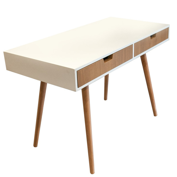 میز تحریر ملانچ، با رویهی سفید و رنگ پوششی ساخته شده است. این میز دو کشو از روکش طبیعی بلوط دارد. پایههای آن از چوب راش طبیعی هستند. پایههای میز به راحتی جدا میشوند. یراق آلومنیومی آن به طور تخصصی برای این مدل پایه طراحی شده است. این میز کاربردهای متفاوتی دارد. میتوان از آن در منزل و محیط کار استفاده کرد. به عنوان میز کار، مطالعه و میز تحریر قابل استفاده است. حتی میتواند یک میز آرایش هم باشد.