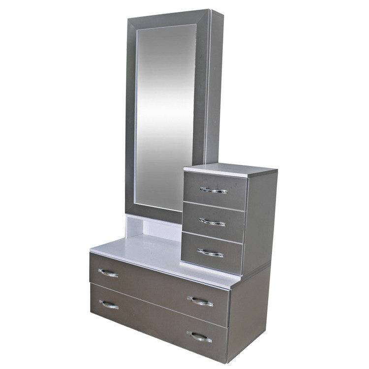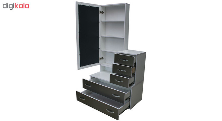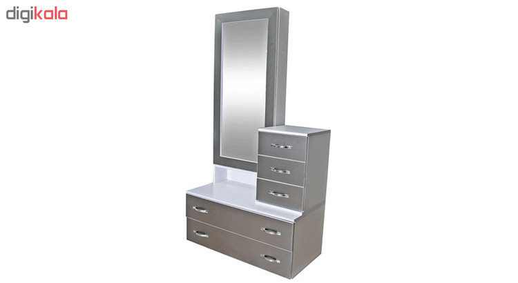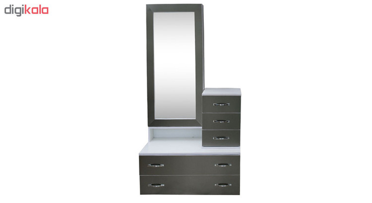 کنسول بعنوان یک محصول ضروری در اغلب اتاق خواب ها است در کنار ایجاد زیبایی در دکوراسیون، به منظم و مرتب نگهداشتن انواع لوازم اتاق خواب کمک میکنند این محصول بسیار شیک و زیبا دارای 5 کشو در دو سایز بزرگ جادار و متوسط و یک در آینه دار میباشد که با باز کردن در آینه ای یک فضای طبقه بندی شده در اختیارتان قرار میگیرد.دارای دسته هایی زیبا و کلاسیک است که جلوه خاصی را به این دراور داده است. این سبک میز آرایش حسابی کشو دار و جادار هستند همچنین فضای پشت آینه محل مناسبی جهت نگهداری لوازم آرایش و یا هر نوع وسیله دیگری می باشد. به ویژه ریل بکار رفته درب های کشوها از نوع ساچمه ای درجه یک با عمر بالا بوده که باعث مقاومت در برابر وزن بالای کشو، کاهش سرو صدا و ایجاد حس آرامش و رضایت در شما می گردد. این میز آرایش ساخته شده از چوب با روکش ملامینه بوده این محصول بدنه ای بسیار مستحکم با طول عمر بالا دارد. جنس چوب و پوشش ملامینه این محصول در برابر رطوبت بسیار مقاوم می باشد و شما میتوانید با استفاده از دستمال مرطوب به راحتی و بدون نگرانی از خراب شدن چوب، بدنه ی آنرا از گرد و غبار پاک کنید.ابعاد این محصول دارای عرض 90 عمق 45 سانتی متر و ارتفاع 170 سانتی متر میباشد