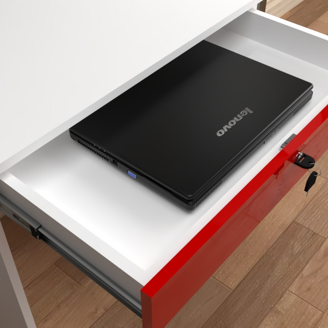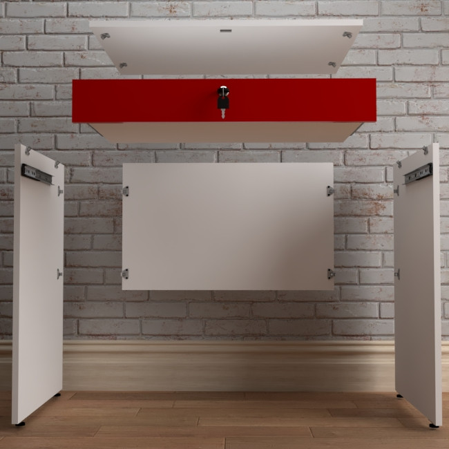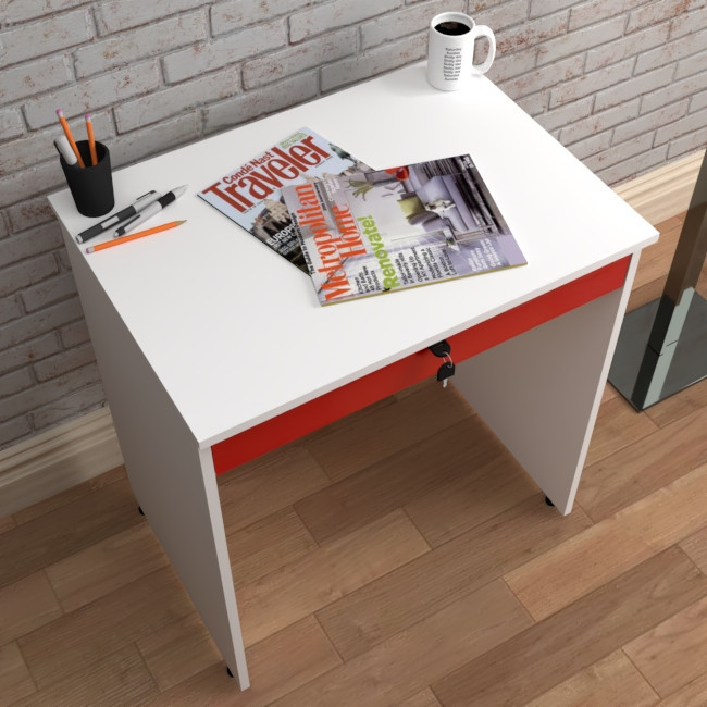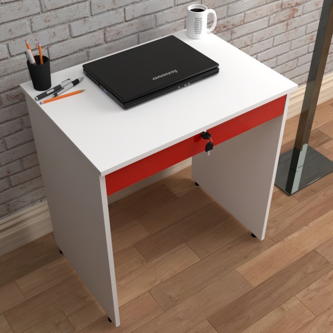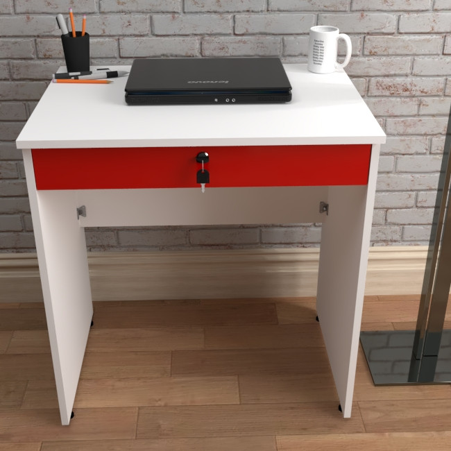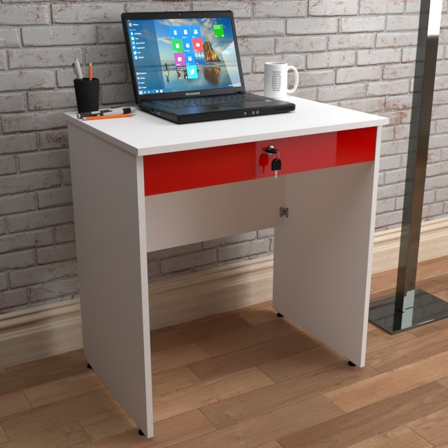 میز تحریر بازشو مدل C-70 در ابعاد 50x70 جهت صفحه , کم جا و جمع جور , مناسب برای فضاهای کوچکتر طراحی و ساخته شده است .استفاده از متریال ام دی اف سفید برفی جهت بدنه و ام دی اف هایگلاس قرمز جهت درب علاوه بر استحکام , به ظاهر میز نیز زیبایی بخشیده است .نوار PVC مصرفی جهت لبه های کار از نوع 2 میل است . اتصالات بست پروانه کریستالی به کار برده شده در ساخت میز ,نه تنها باعث شده که بازوبست میز به راحتی انجام شود بلکه استحکام بالاتری نسبت به اتصال الیت دارد .ریل سه تیکه ساچمه ای باعث شده کشو به راحتی بازوبسته شود . این کشو فضای لازم جهت قرار گرفتن لبتاب را دارد . قفل روی درب طرح رونیس با کلید تاشو است .