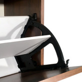 جا کفشی مدل «375B» که درنگاه اول به صورت یک پارچه دیده میشود در واقع از سه طبقه مستقل به عنوان جای کفش با قابلیت قرار گرفتن ۱۸ تا ۲۴ جفت کفش در نظر گرفته شده است. در صورت نیاز قابلیت برداشتن صفحه جداکننده هر طبقه برای ایجاد فضای بیشتر برای کفشهای ساق دار وجود دارد. جنس بدنه خارجی از نئوپان با روکش ملامینه ضد خش که در برابر ساییدگی و رطوبت مقاوم میباشد که تمام لبههای خارجی کار با نوار پیویسی به ضخامت یک میلیمتر پوشانده شده که در برابررطوبت محیط و جابجایی مقاومت بالایی به محصول میدهد. اتصالات بکار رفته دراین محصول بصورت توکار بوده و هیچگونه پیج و سوراخی بر روی محصول وجود ندارد، طبقات جاکفشی از جنس امدیاف ۸ میلیمتری با روکش ملامین انتخاب شده ولبه های خارجی آن با نوار پیویسی پوشانده شده تا در هنگام نظافت داخل جاکفشی از نفوذ آب ورطوبت جلو گیری نماید . این کار برای برای سلایق مختلف در سه رنگ قهوهای(گردویی)، قهوهای روشن(آنتیک) و سفید تولید شده است