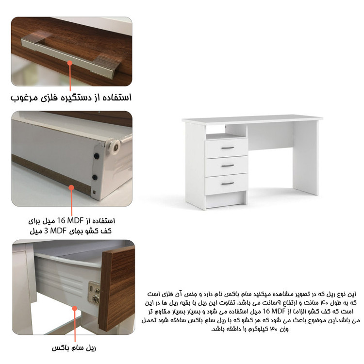 میز اداری مدل TO-309 طراحی و تولید شرکت انتخاب اول است.این میز مناسب برای میز منشی و غیره می باشد که در حین کاربردی بودن میز فضای بسیار کمی اشغال می کند و همین موضوع باعث شده که حمل و نقل آن به راحتی صورت گیرد.تمامی قسمت ها از ام دی اف 16میل و مرغوب استفاده شده است.قابل توجه هست که شرکت انتخاب اول برای کشوهای این میز ریل سام باکس در نظر گرفته که همین امر موجب استحکام بیشتر کشوها شده است و وزنی بین 30 تا 40 کیلوگرم هر کشو تحمل می کند.تفاوت ریل سام باکس با بقیه ریل ها در این است که چون ریل ارتفاعی حدود 9 سانتی متر دارد، خود نقش بدنه کشو را ایفا میکند و بخاطر نوع طراحی این ریل باید از ام دی اف 16میل برای کف کشو استفاده شود در صورتیکه در بقیه کشوها برای کف کشو از ام دی اف 3میل استفاده میشود و همین موضوع باعث می شود که این کشو نسبت به سایر کشوها بسیار مقاوم تر باشد .لطفا برای مشاهده نوع ریل به عکسهای محصول در گالری مراجعه کنید.