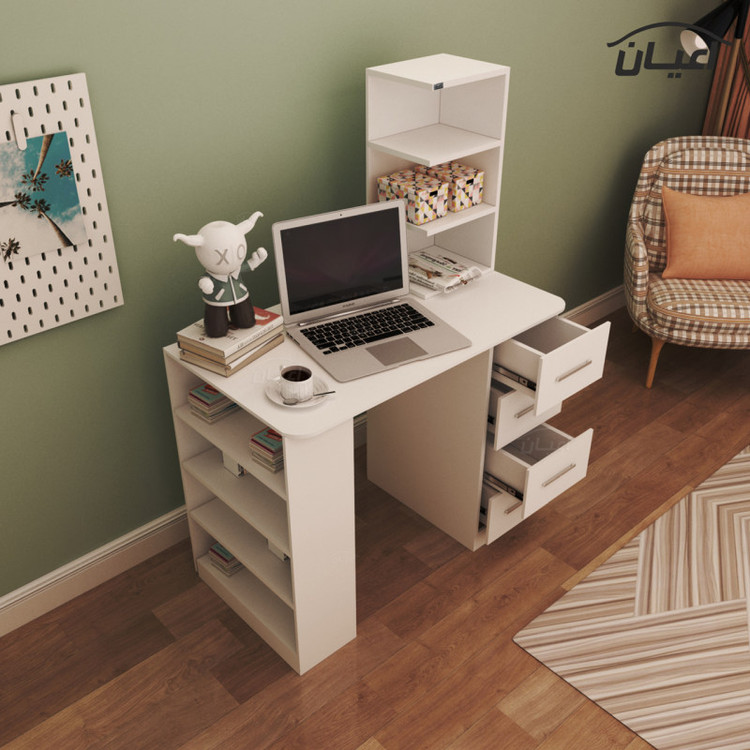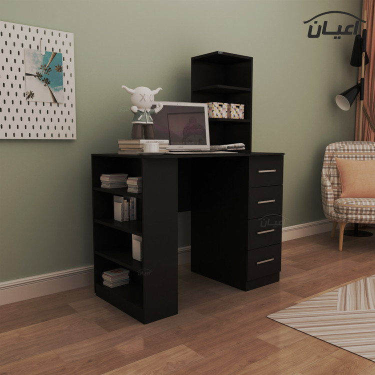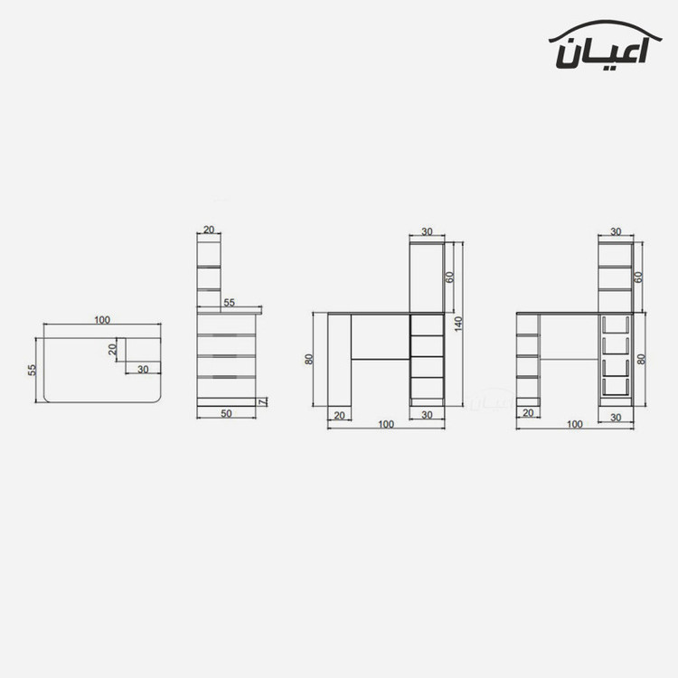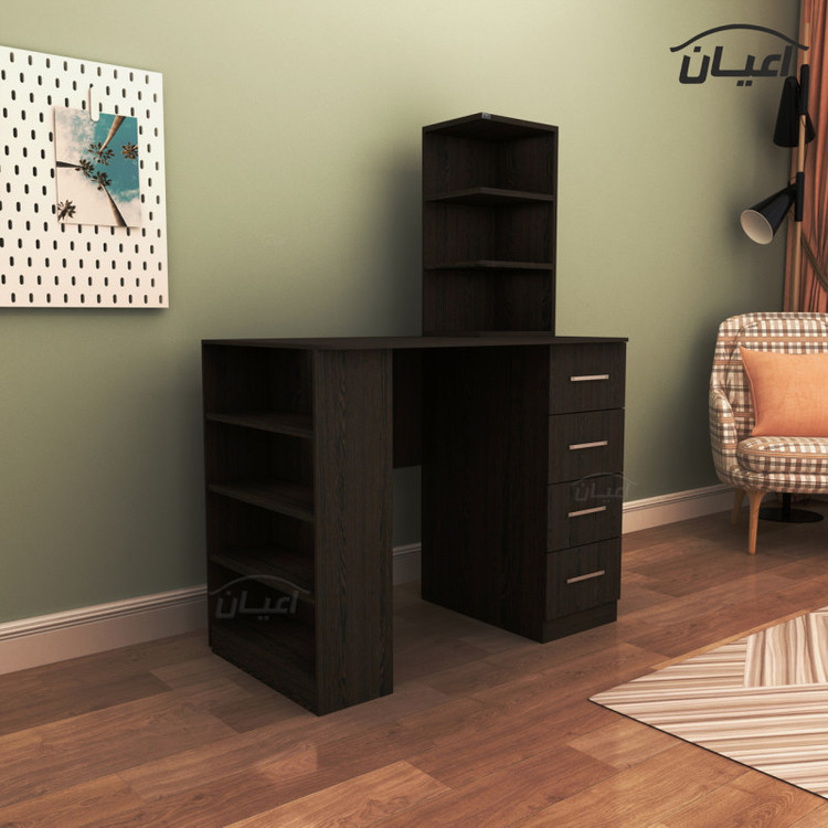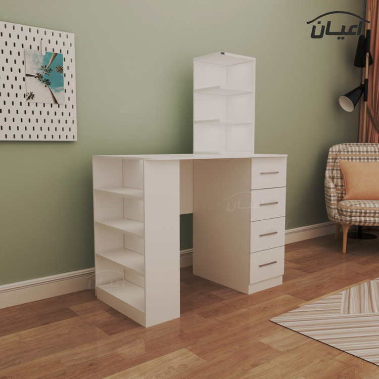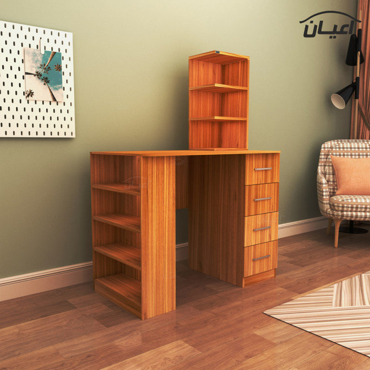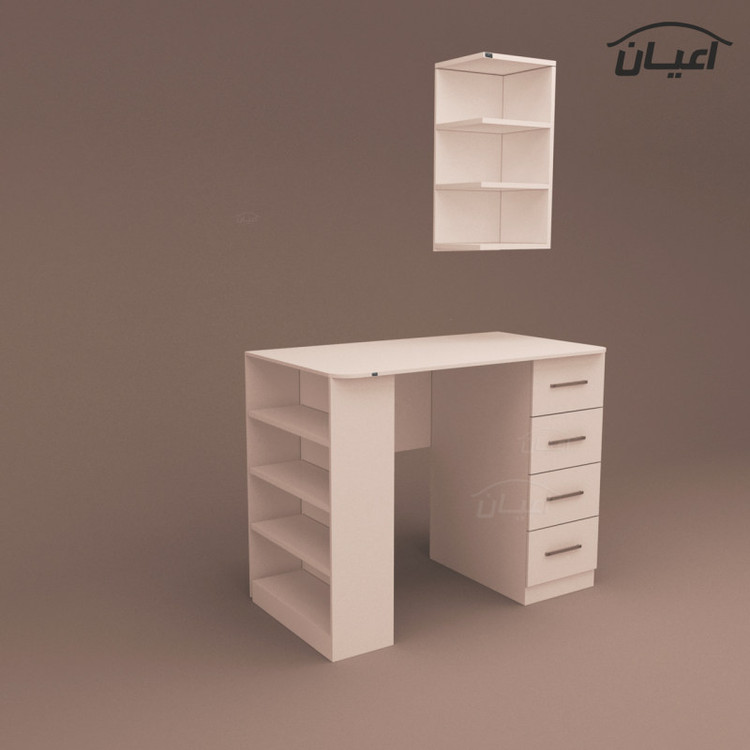 میز تحریر اعیان.جنس ملامینه .سطح ضدخش.طراحی ساده و کاربردی.وزن متناسب با ابعاد.قابل استفاده در منزل و محل کار.تحمل وزن متناسب با ابعاد و به صورت استاندارد.در رنگ های متنوع.بسته بندی با لوگو و برند اعیان.مناسب برای تمام سنین.دارای چهار کشوی و دو فضای کتابخانه.کتابخانه بدنه ثابت میباشد . کتابخانه روی صفحه میز از نوع جدا شونده میباشد.