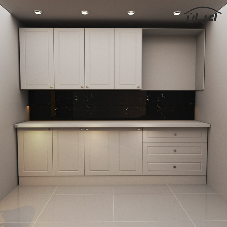 جنس ملامینه نوار پی وی سی بدنه سفید یونیت زمینی ،هوایی دارای سبد آبچکان. درب ها به صورت آرام بند. کشو ها با ریل سه تکه.