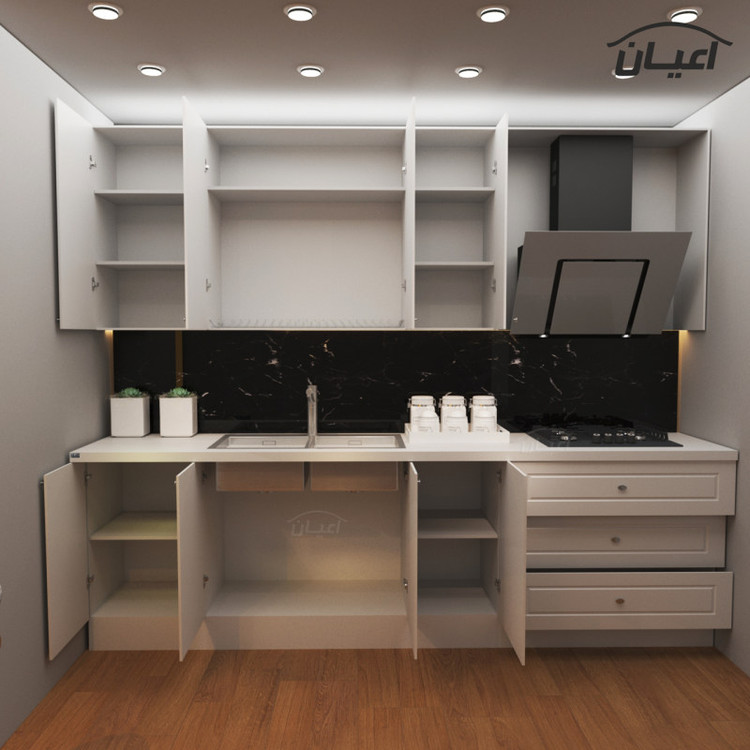 مجموعه کابینت های زمینی و کابینت های هوایی.دارای صفحه یک تکه. دارای پاخور یک تکه.جنس ملامینه و وکیوم میباشد. دارای یونیت و سبد آبچکان. یونیت ها در ابعاد : یونیت تک درب 50 و یونیت تک درب 40.یونیت سه کشو 95 یونیت سینک 90 میباشد. سینک ندارد و به دلیل متنوع بودن ابعاد سینک،جای سینک روی صفحه تعبیه نگردیده است. این مجموعه فاقد سینک ، گاز ، هود میباشد. بسته بندی با لوگو و برند اعیان.هنگام خرید و دریافت کالا به بسته بندی و لوگوی برند اعیان دقت فرمایید.