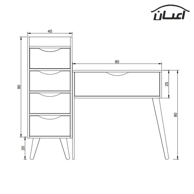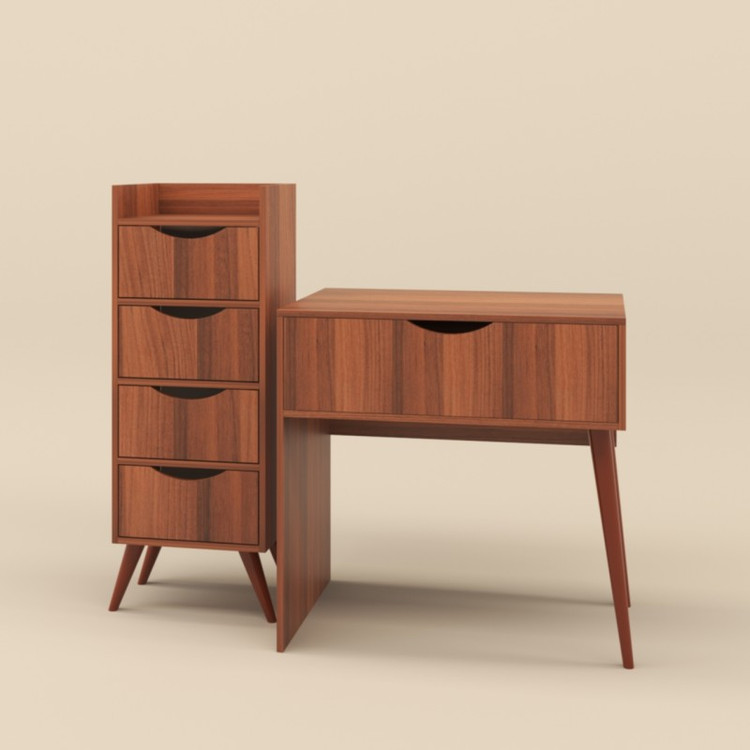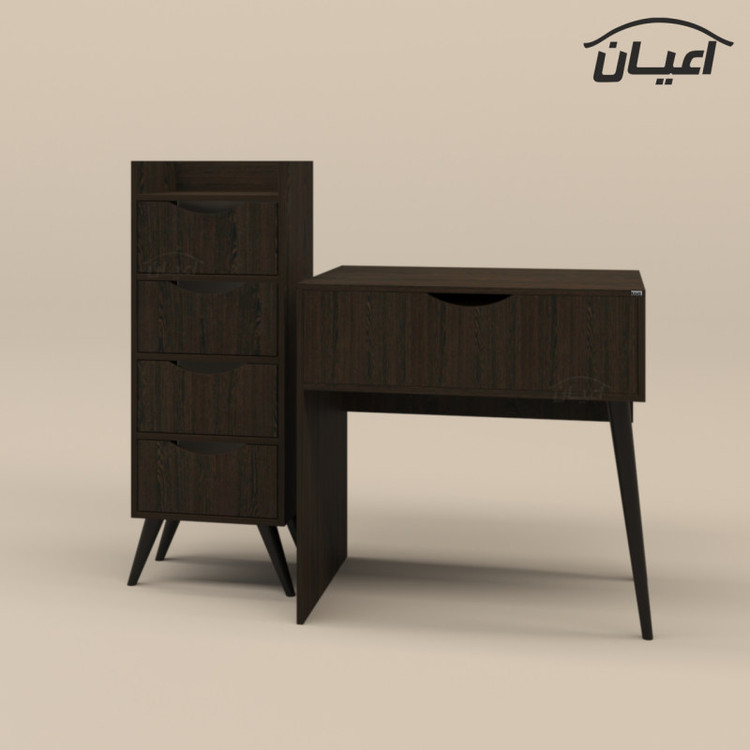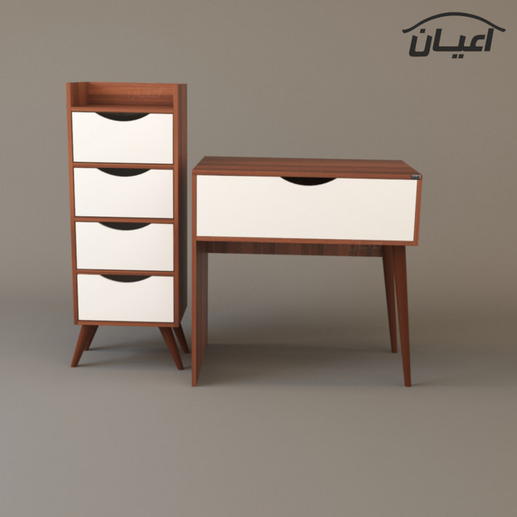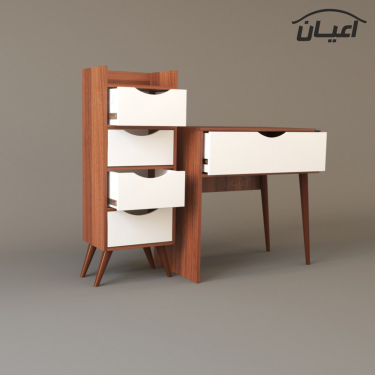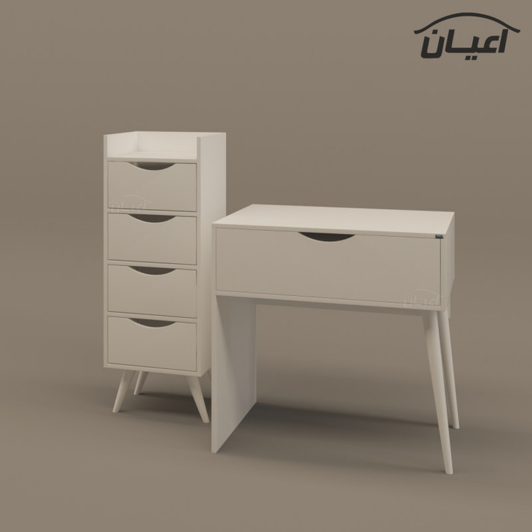 جنس ملامینه. وزن متناسب با ابعاد. نوار پی وی سی. مجموعه 2 عددی شامل میز آرایش با ابعاد طول 80 عرض 50 ارتفاع 80 و دراور با ابعاد طول 40 عرض 35ارتفاع 110