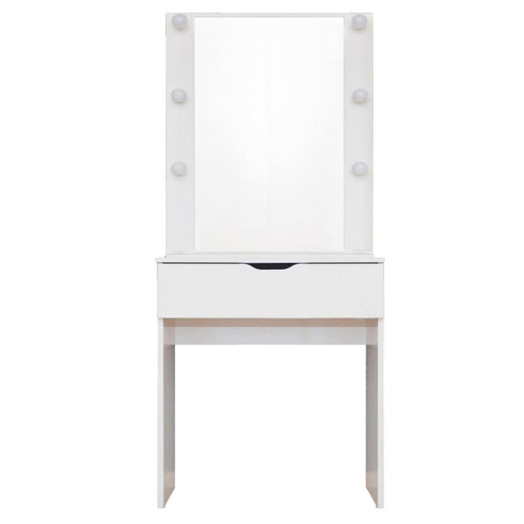 میز آرایش و گریم تک کشو به همراه قاب آینه مجهز به سرپیچ لامپ با قابلیت اتصال 6 لامپ می باشد که در واقع یک میز آرایش و گریم حرفه ای برای استفاده بانوان می باشد روی قاب آینه تعداد 6 عدد سرپیچ درنظر گرفته شده و سرهم بندی شده است. برای روشن کردن چراغ ها یک عدد کلید کوچک در سمت راست قاب اینه قرار دارد و دارای دو متر سیم و دوشاخه برق میباشد.